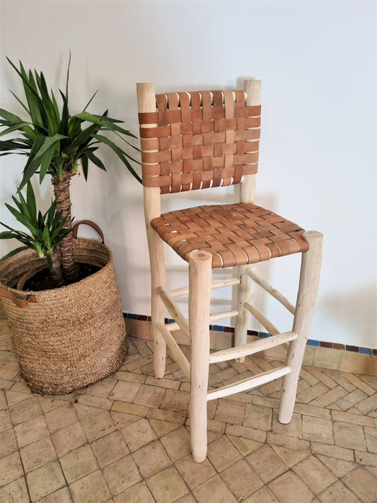 Tabouret de bar design Moroccan laurier assise en cuir Camel
