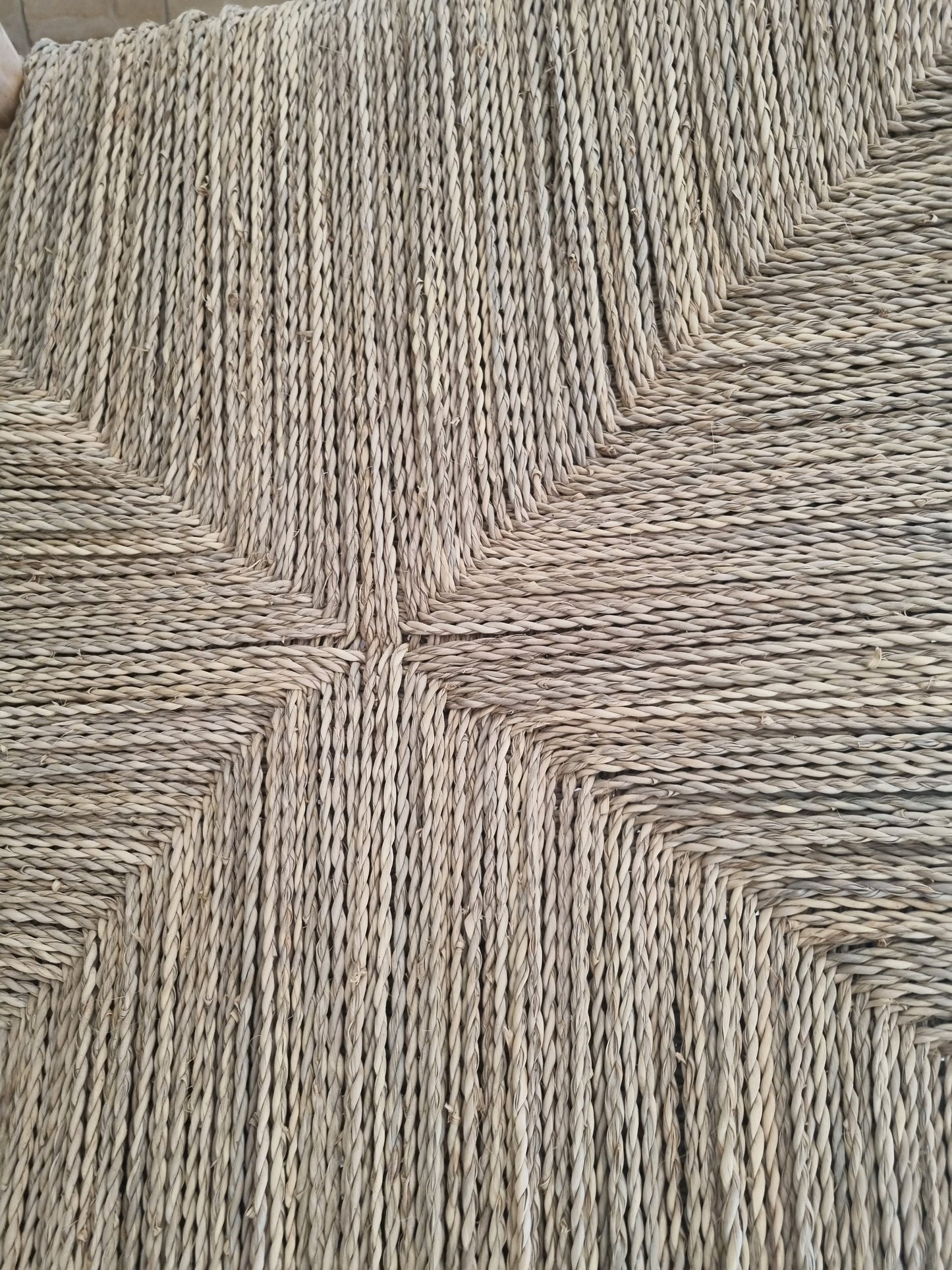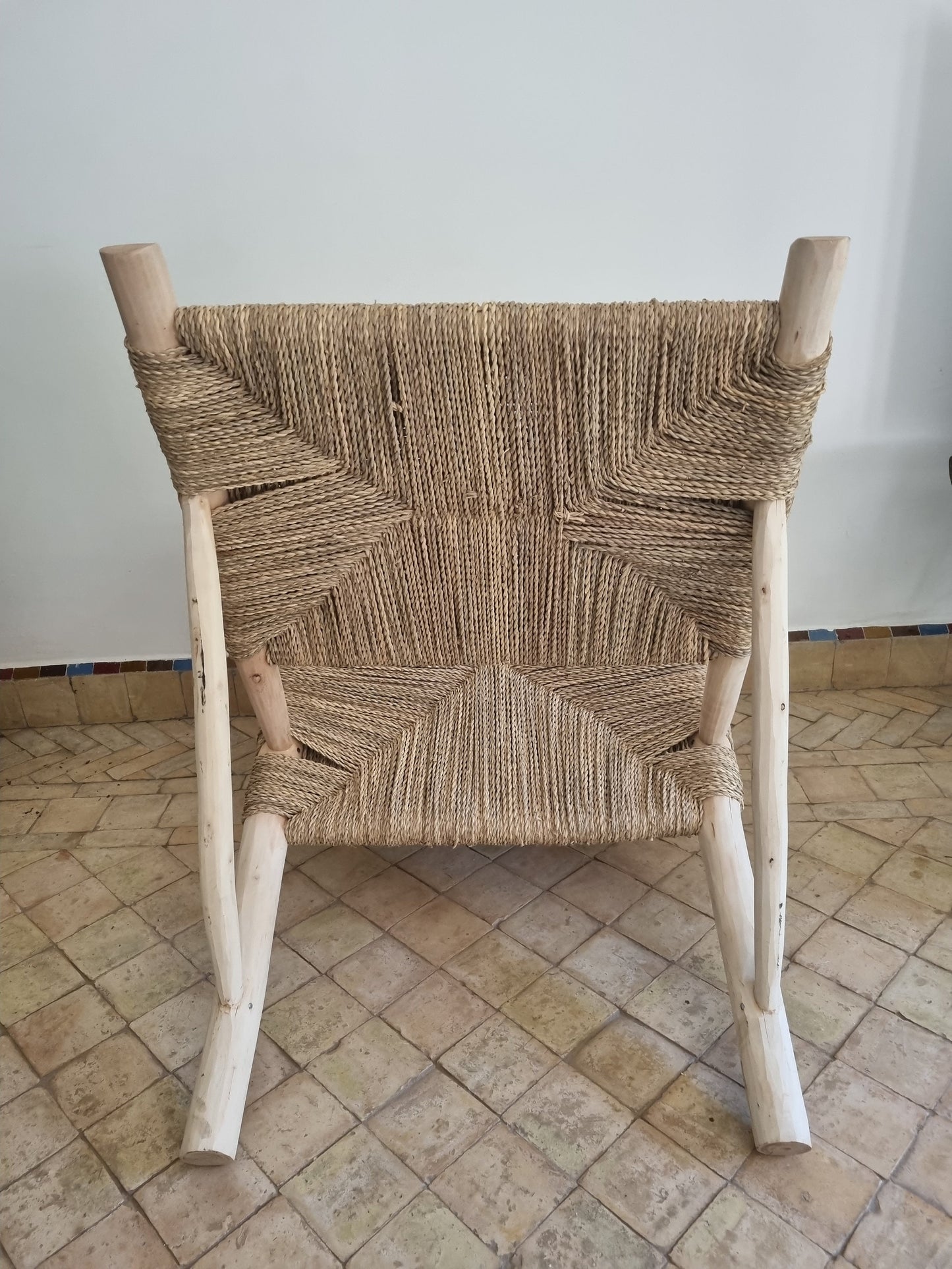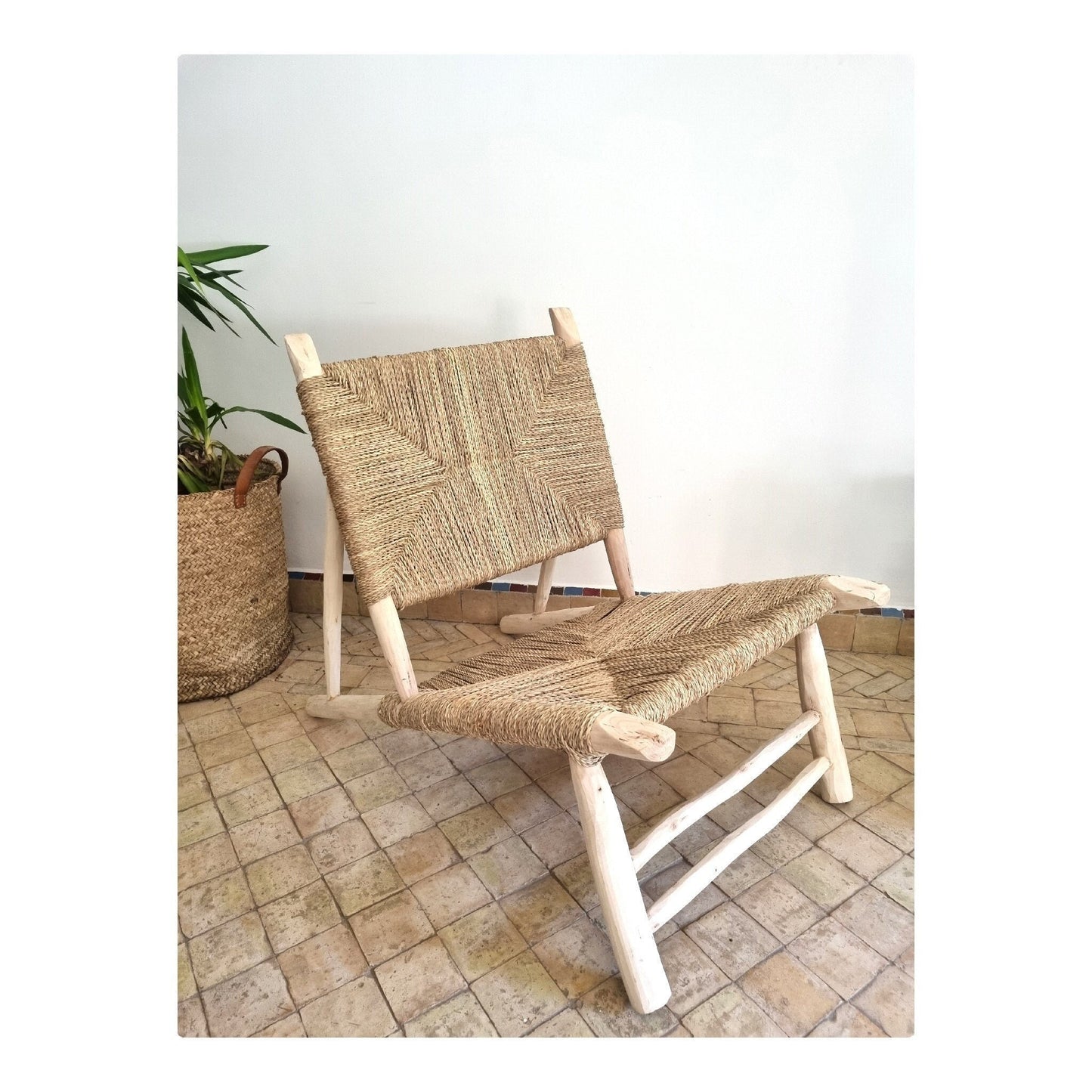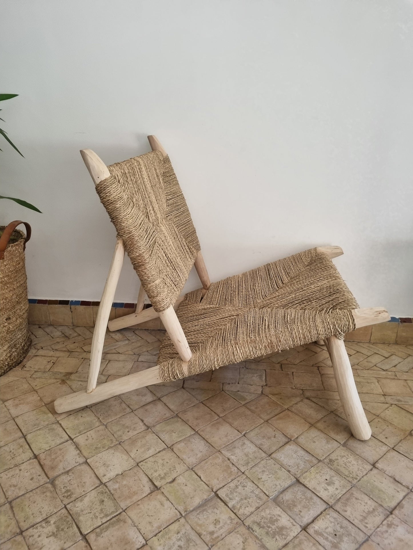 Fauteuil marocain artisanal en bois de laurier assise en corde naturel , indispensable pour une décoration bohème chic.