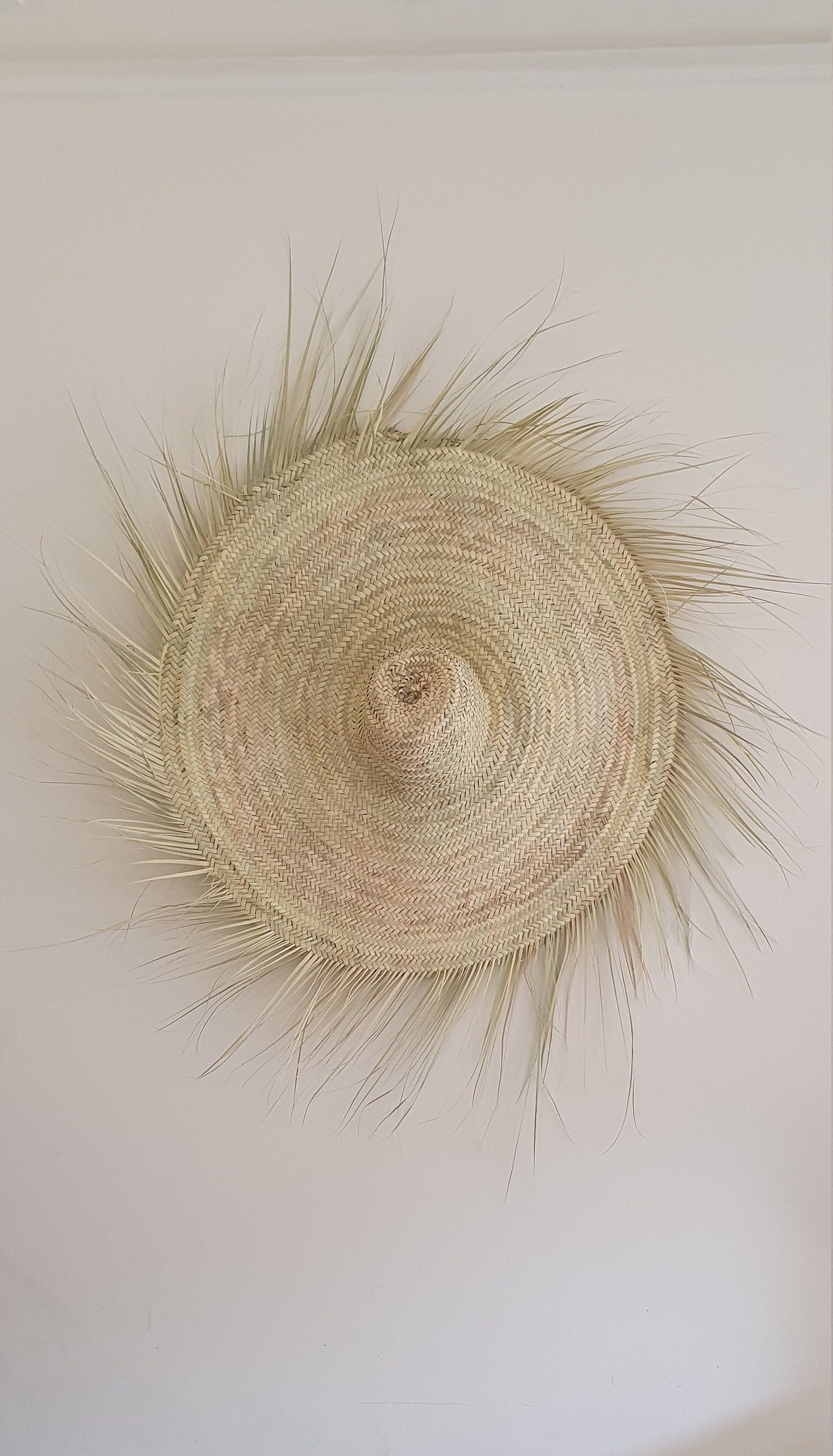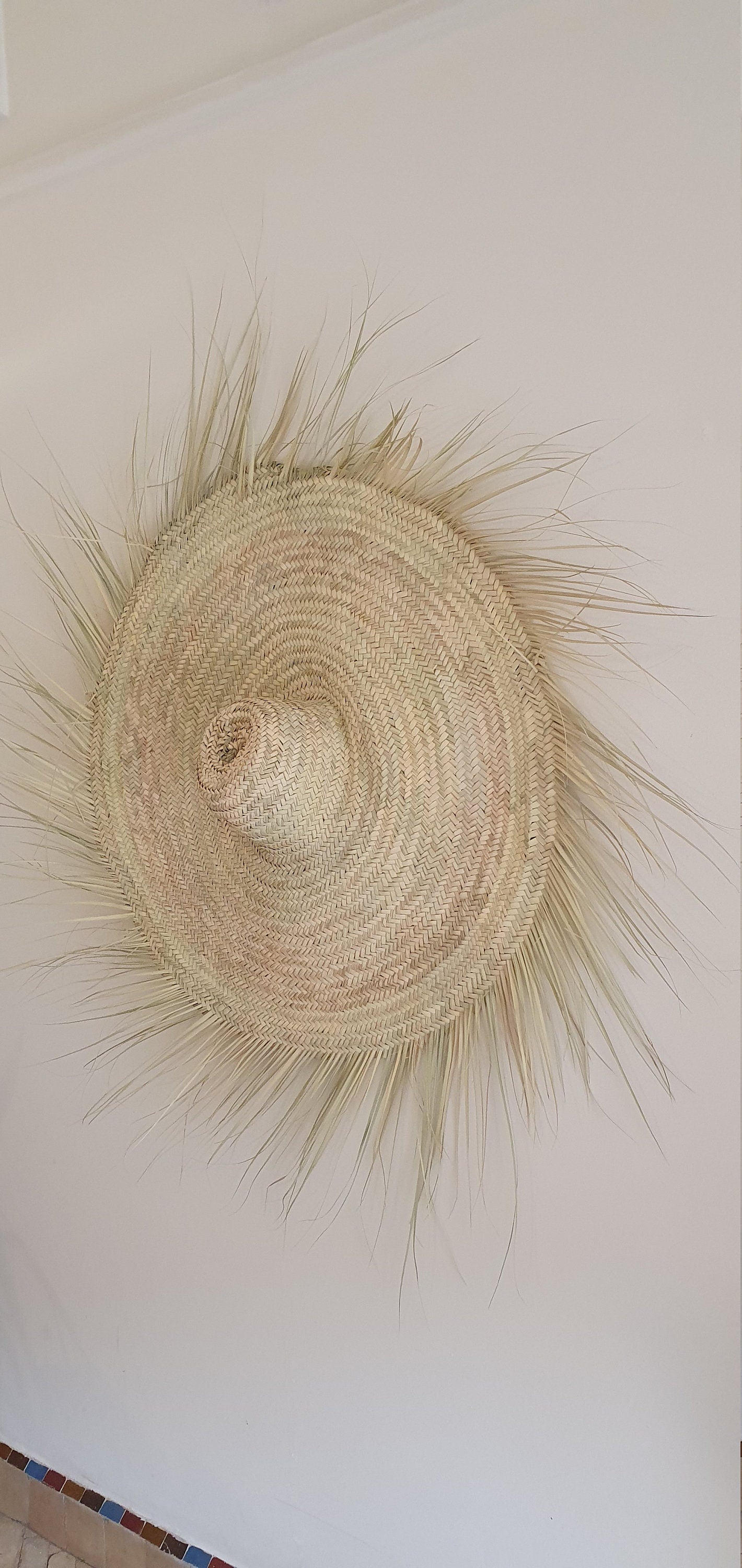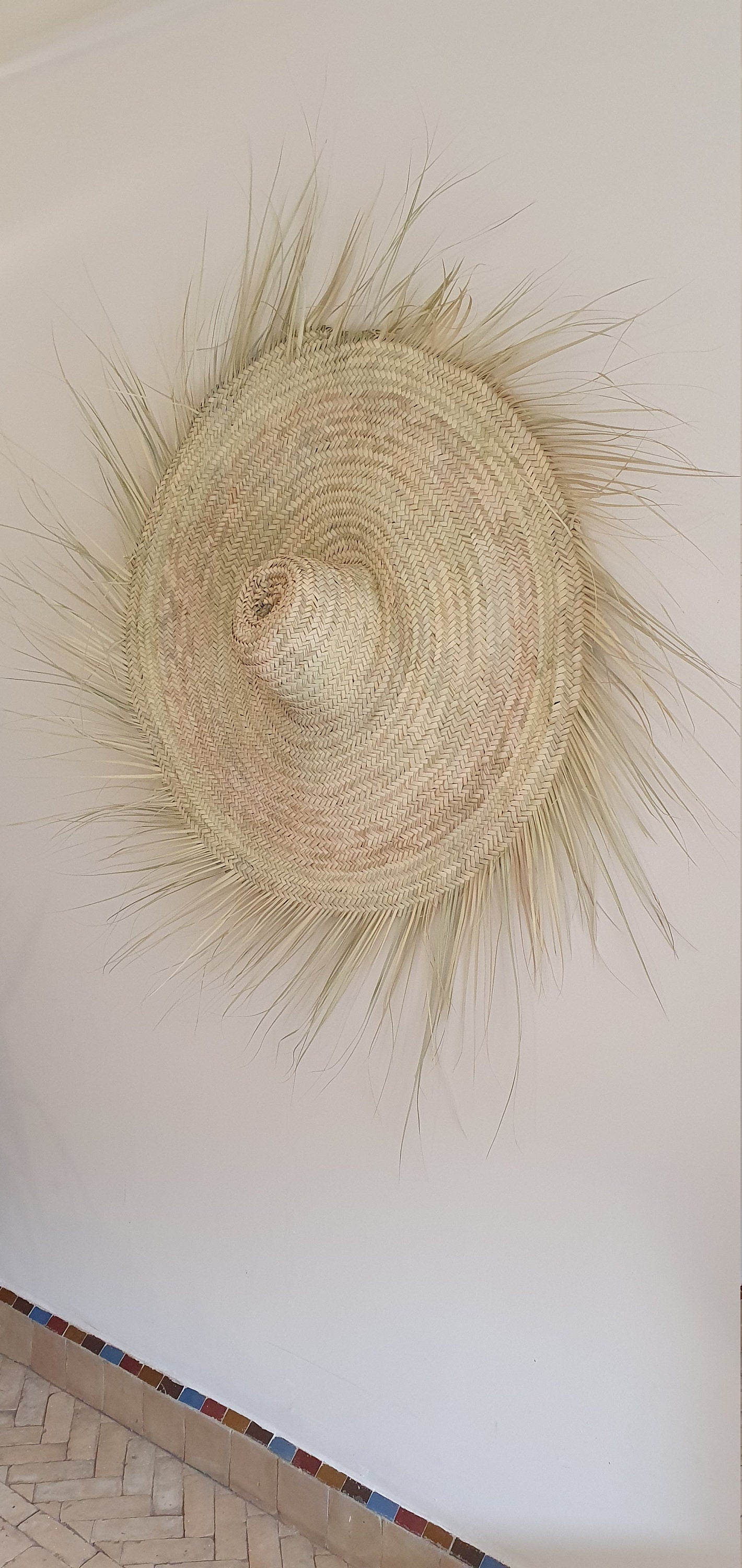 Chapeau de paille décoration murale ceci est fait à la main chaque piece est unique. Les Couleurs et les tailles peuvent varier en de l'état du Matériau. La couleur est souvent verte quand la matière est jeune et devient de plus en plus jaune avec le temps.