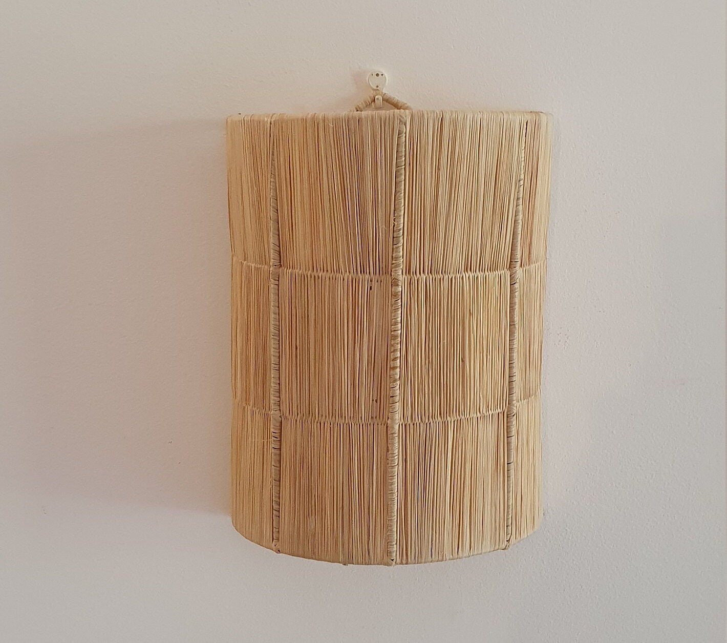 Applique murale artisanale et armature en fer. Simple et élégante, elle se fait discrète la journée, et diffuse une très belle lumière le soir. Matière brute et naturelle, le raphia sublime le mur et offre une lumière douce et tamisée.