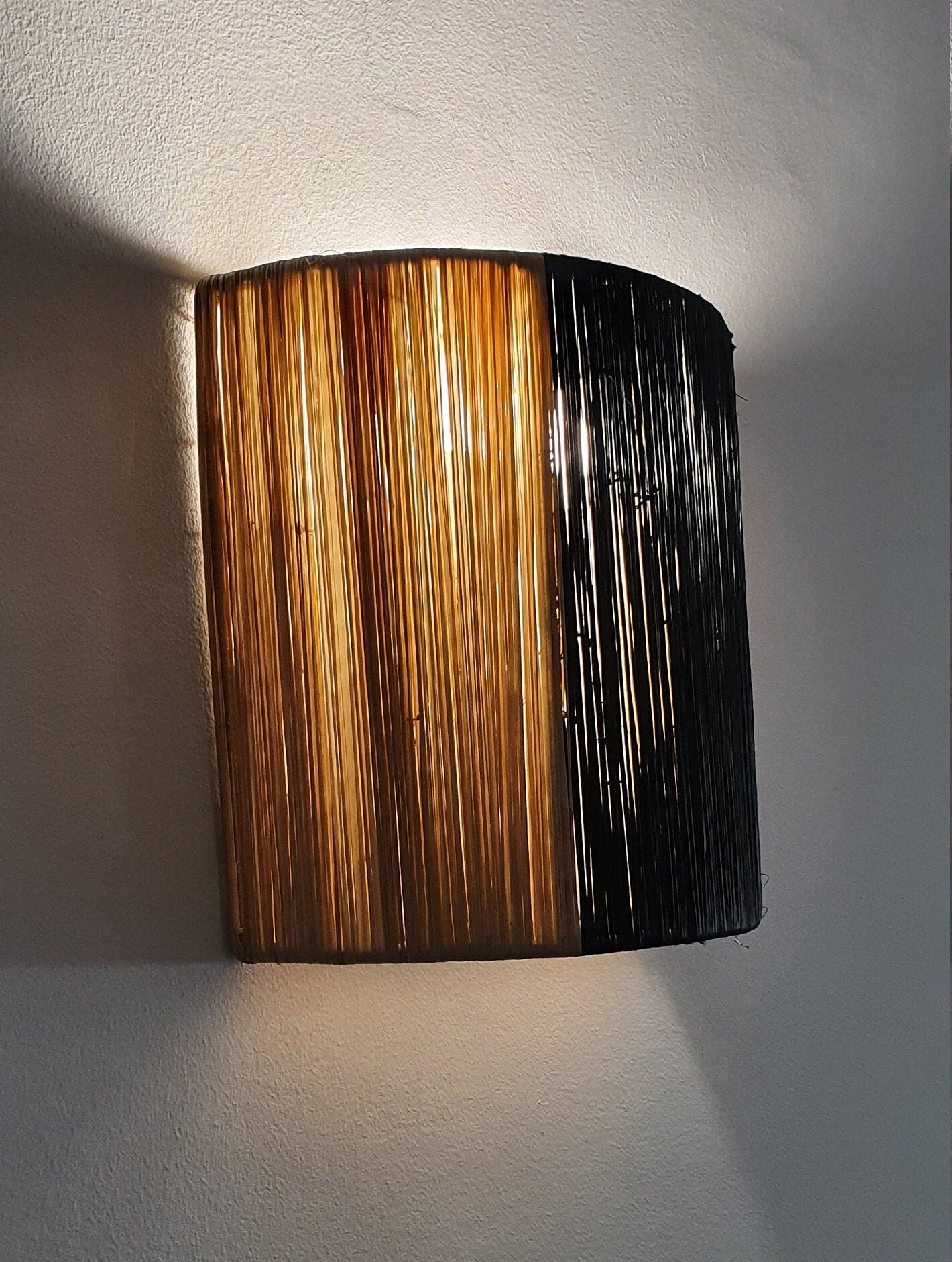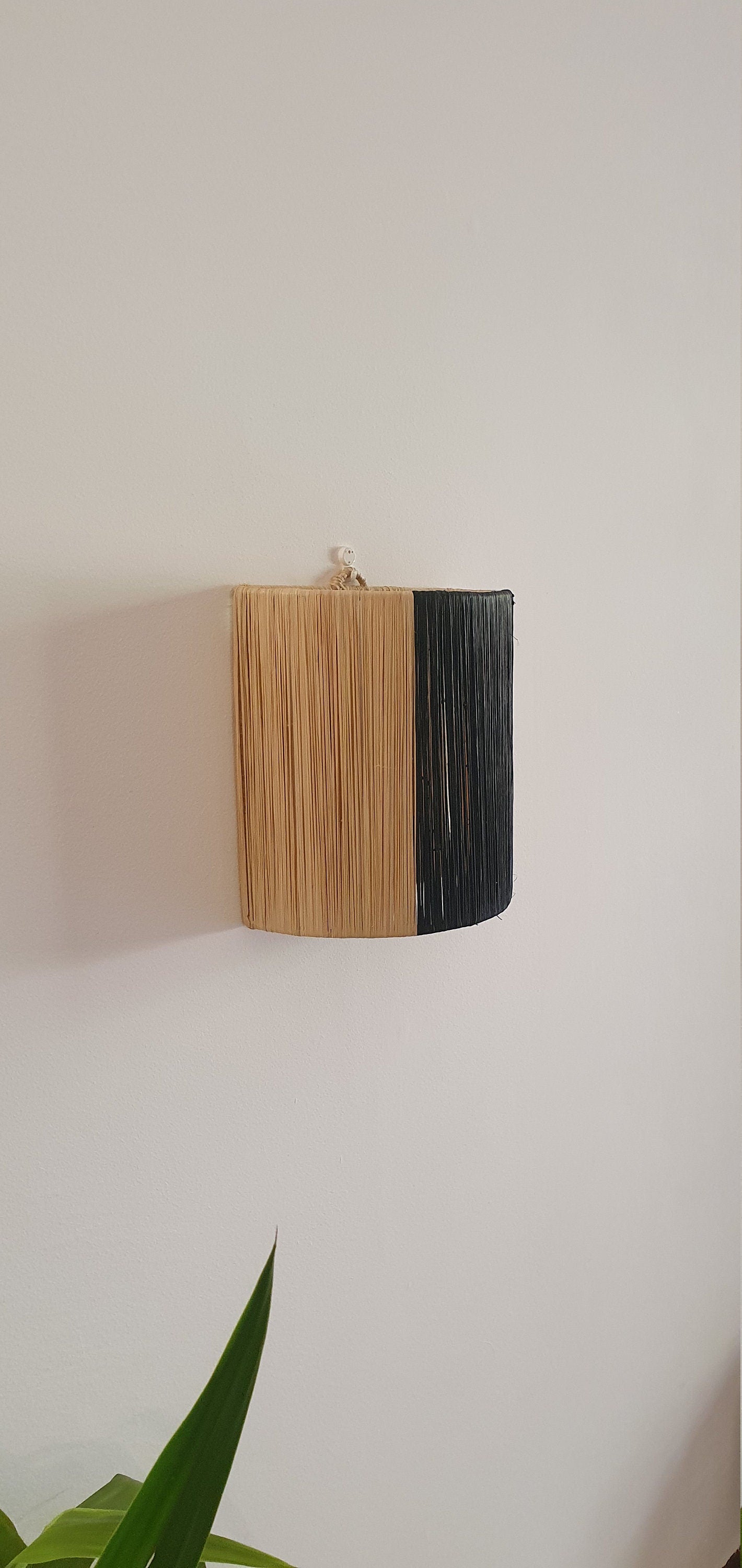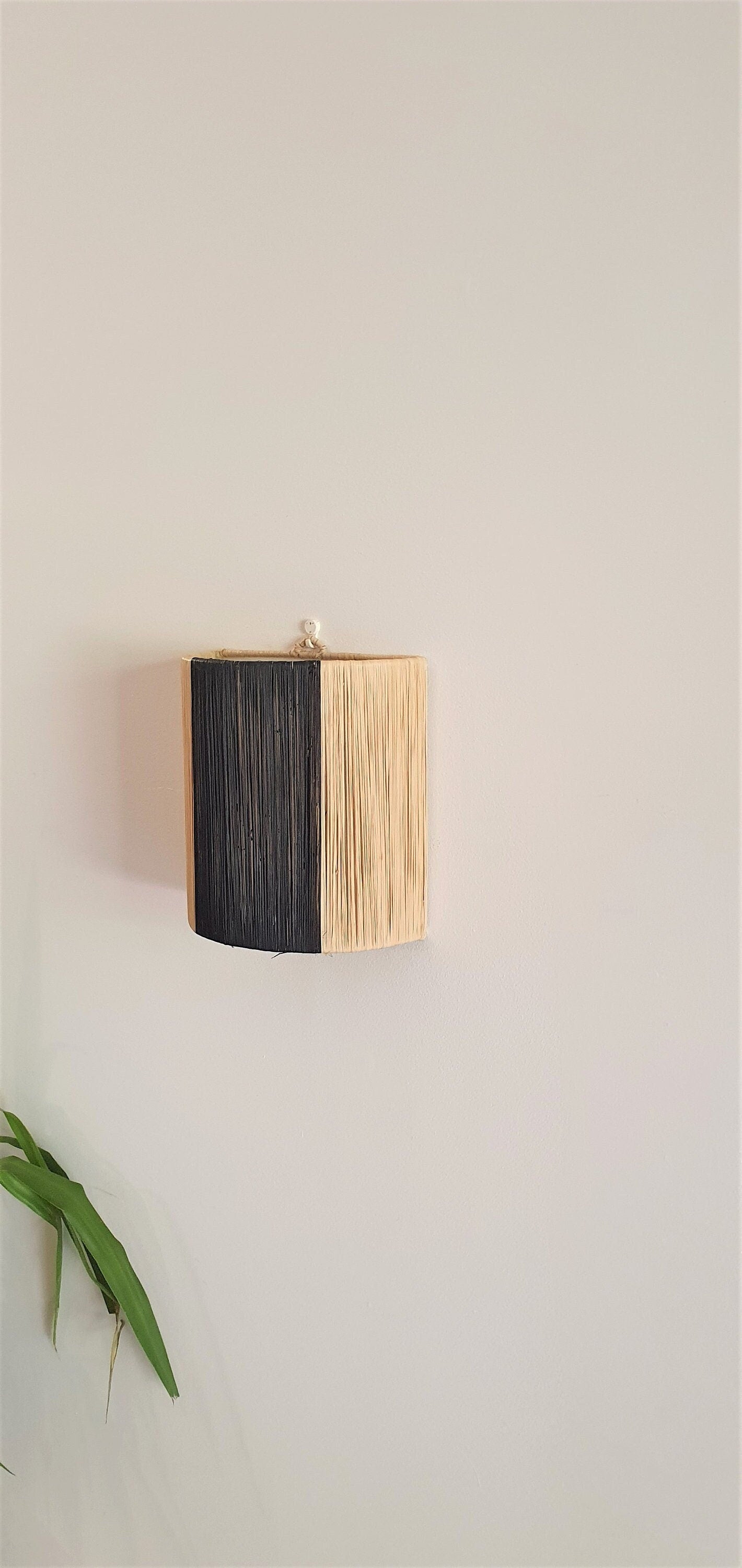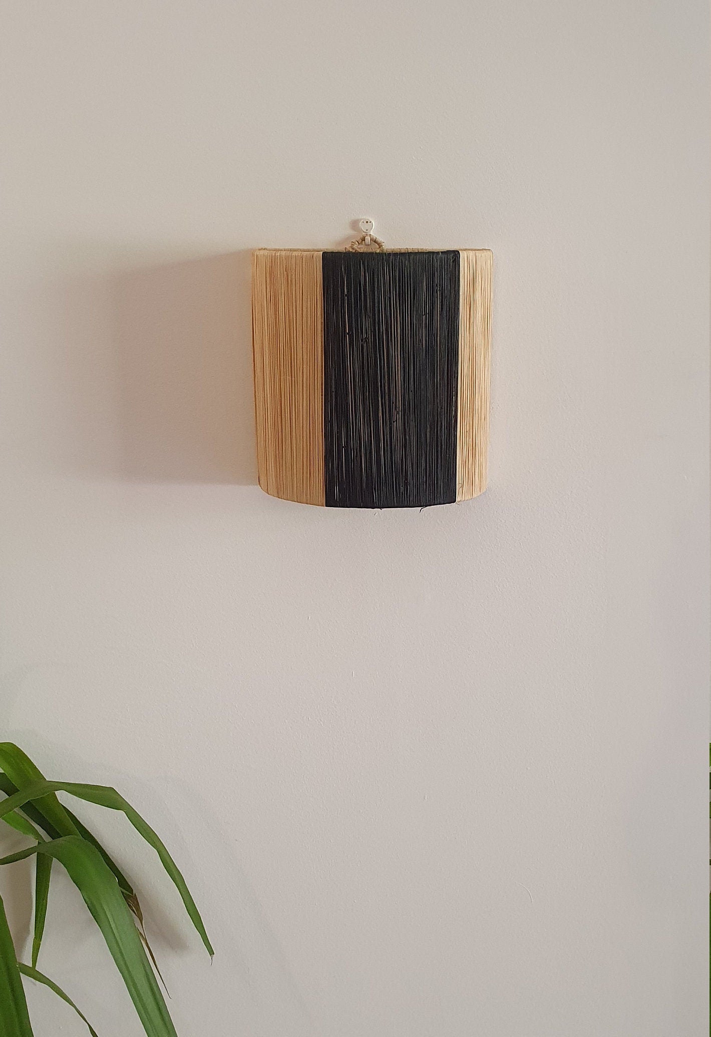 Applique murale salon paille et armature en fer simple et élégante, elle se fait discrète la journée, et diffuse une très belle lumière le soir. Matière brute et naturelle, le raphia sublime le mur et offre une lumière douce et tamisée.