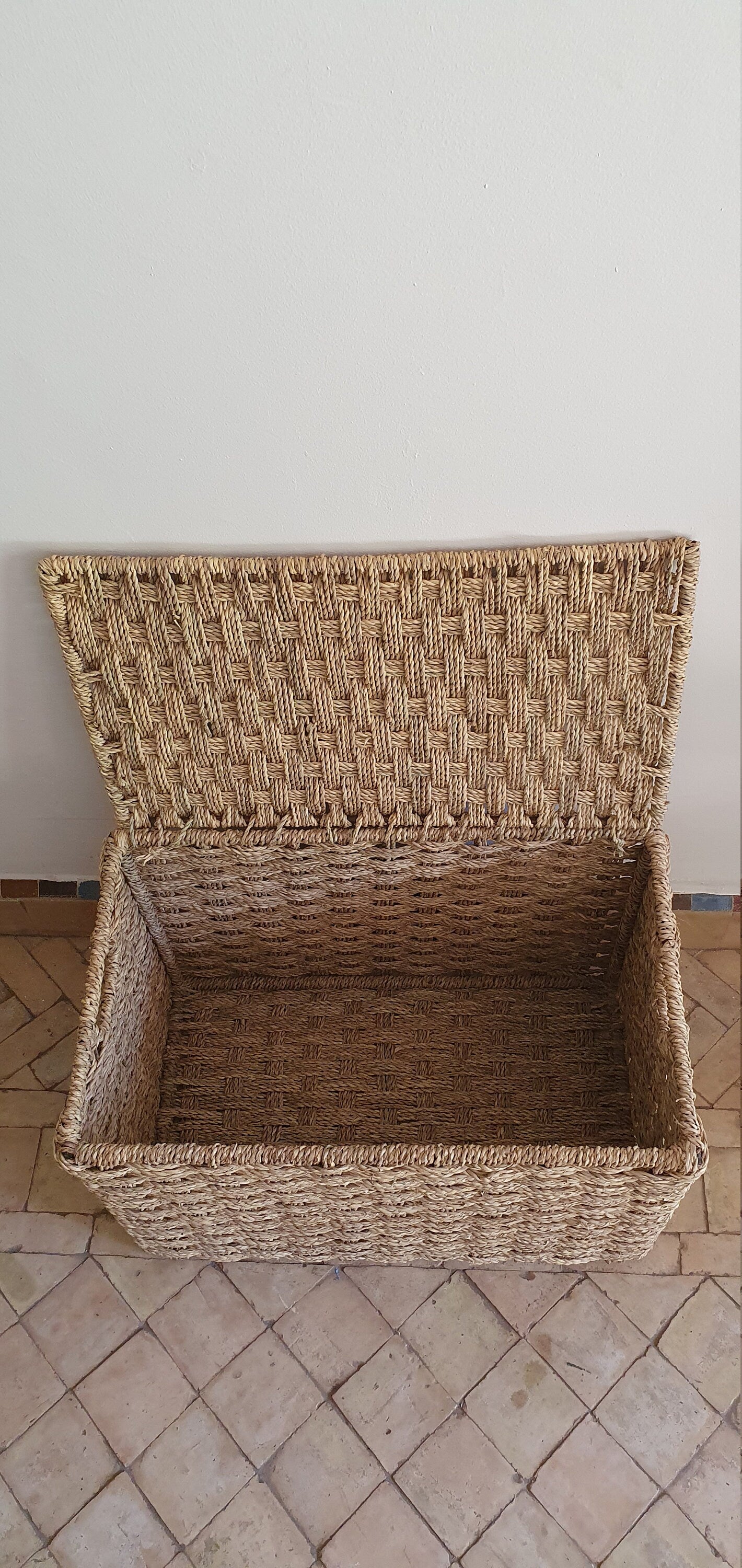 Coffre à jouet osier en fibres Naturelles : osier et palmier, tressée main par des artisans de marrakech . La teinte est douce, presque blanche, pour une touche naturelle et bohème. Elle peut s’intégrer à n’importe quelle pièce: un salon, une chambre d’enfants, une salle de jeux…