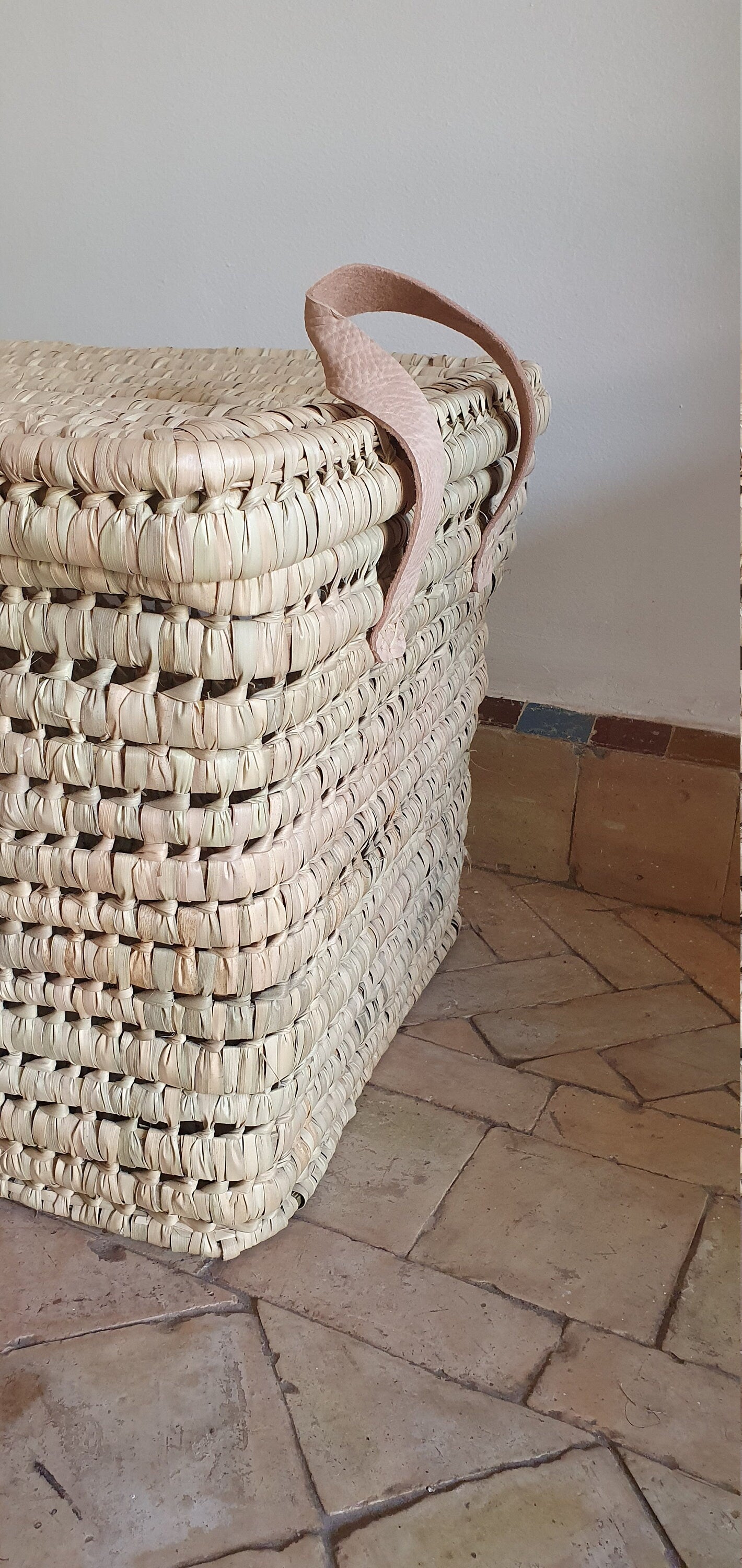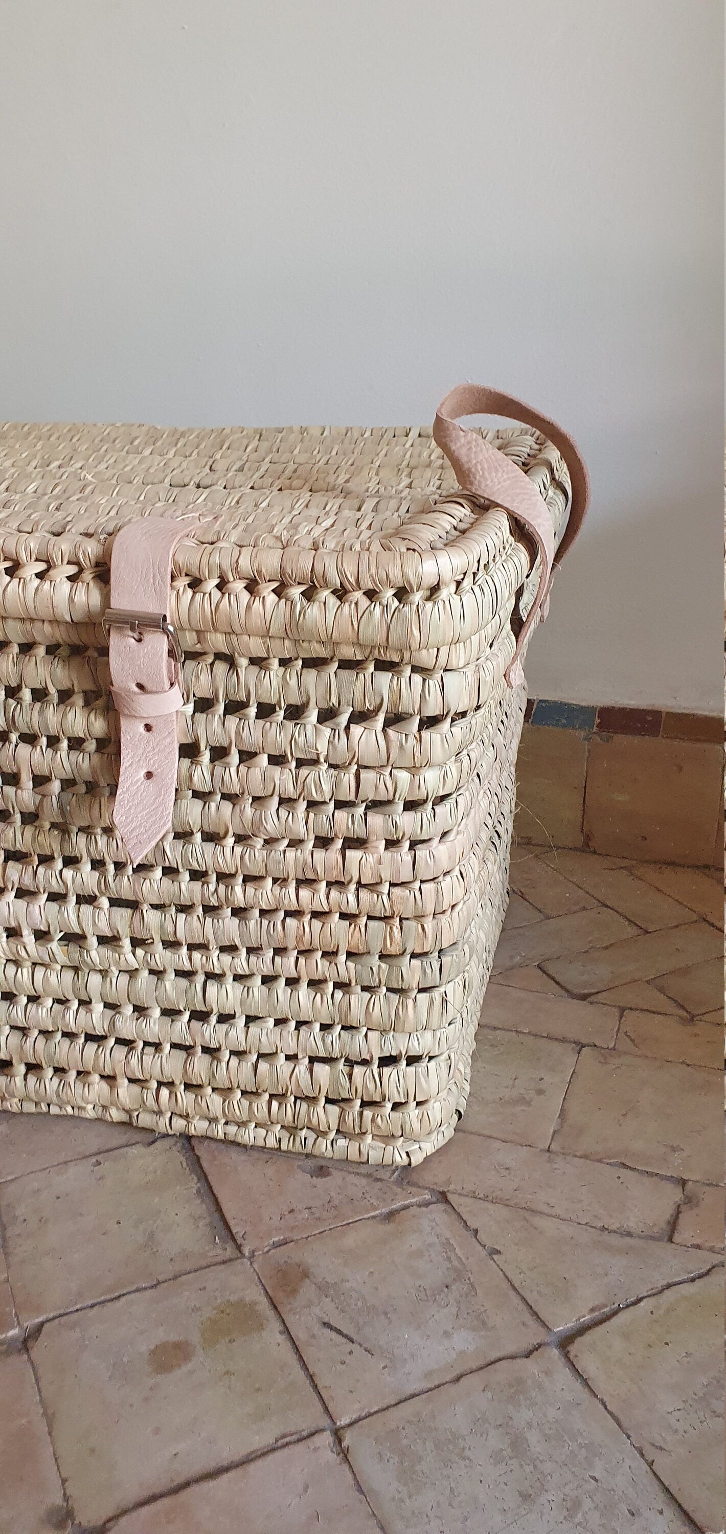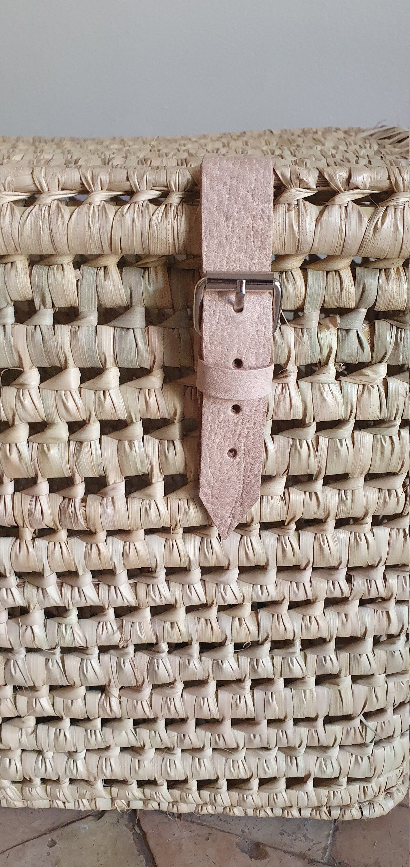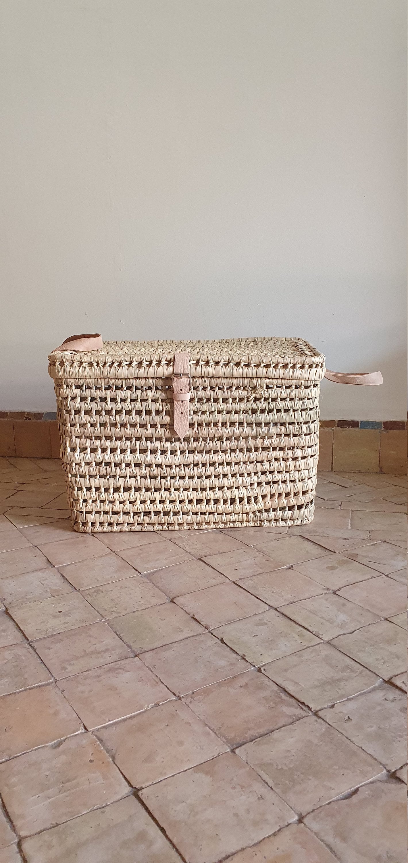 Ce Coffre de Rangement en feuilles de palmier anses en cuir offre une touche d'élégance naturelle à votre espace de vie main par des artisans de Marrakech . La teinte est douce, presque blanche, pour une touche naturelle et bohème. Elle peut s’intégrer à n’importe quelle pièce: un salon, une chambre d’enfants, une salle de jeux…