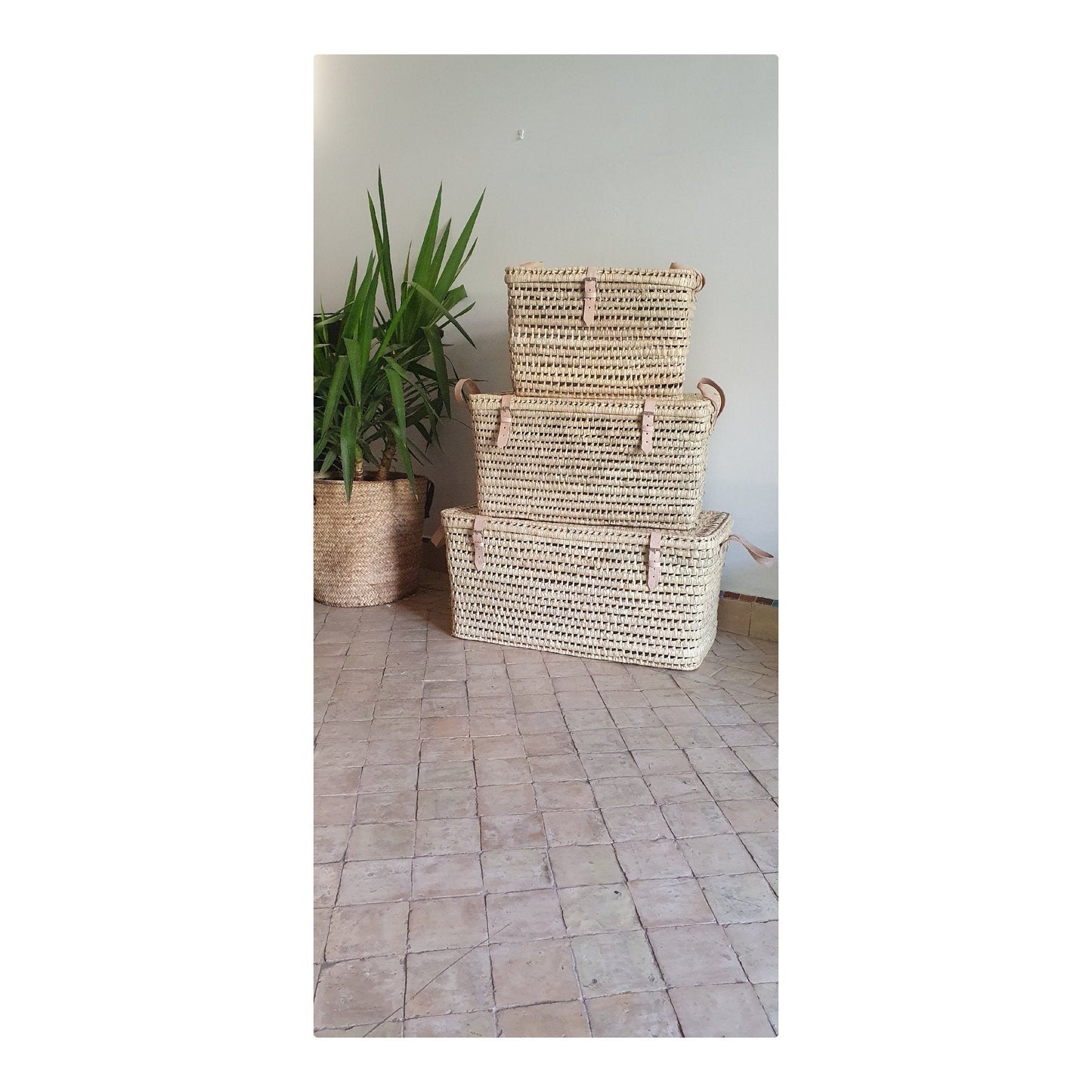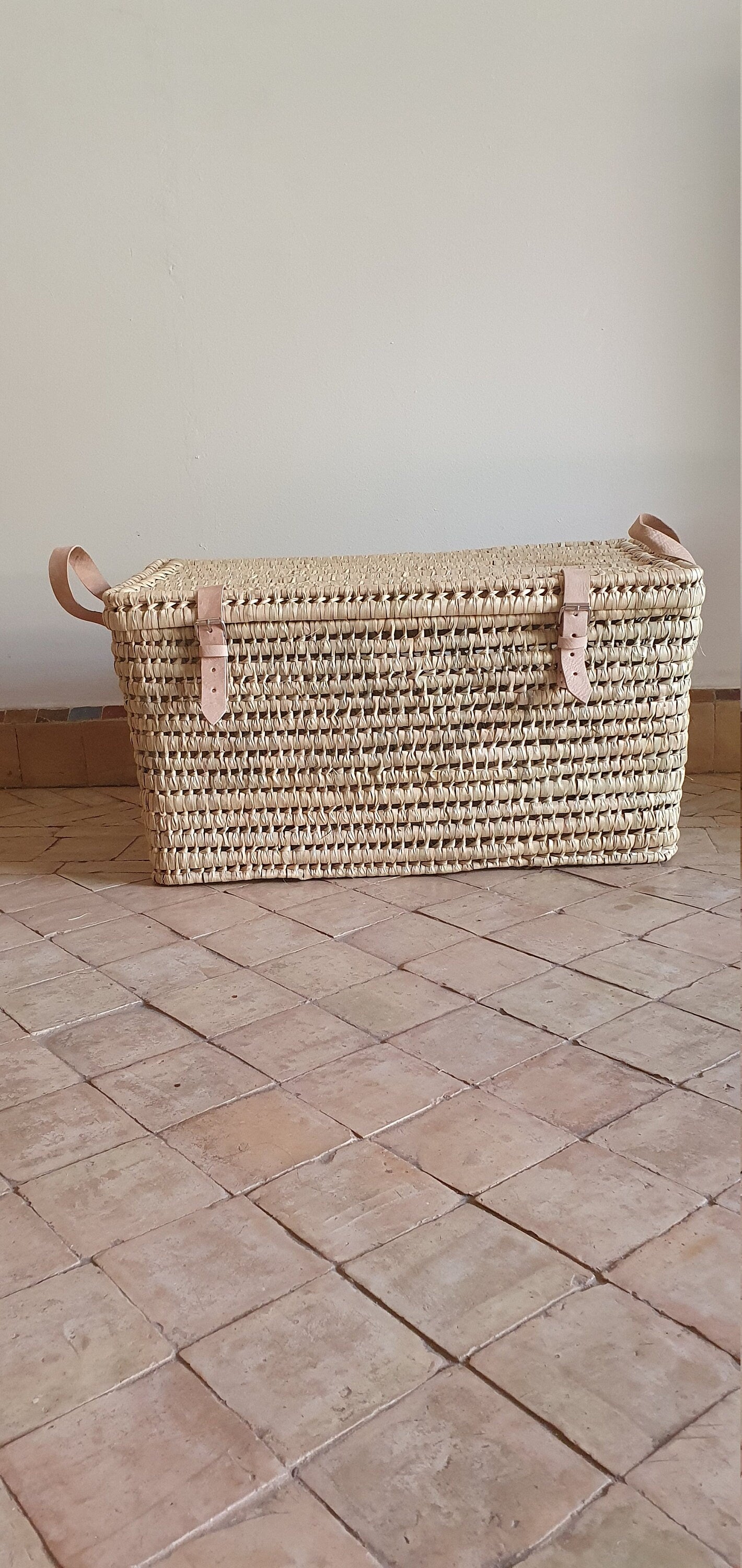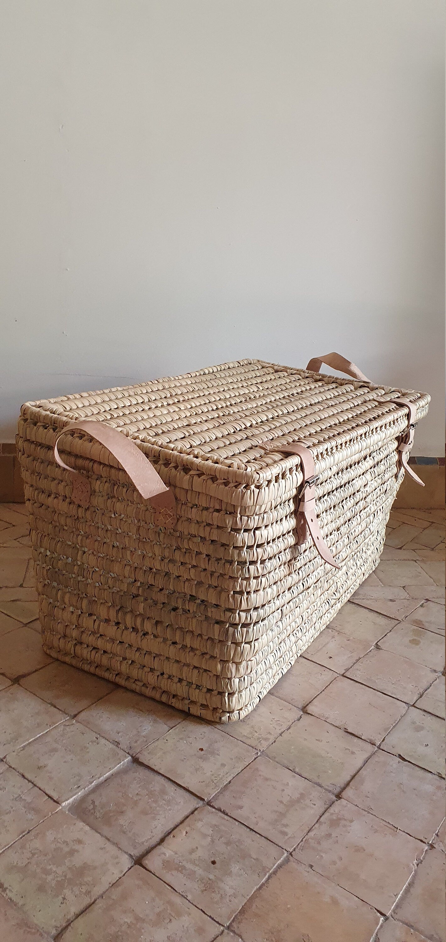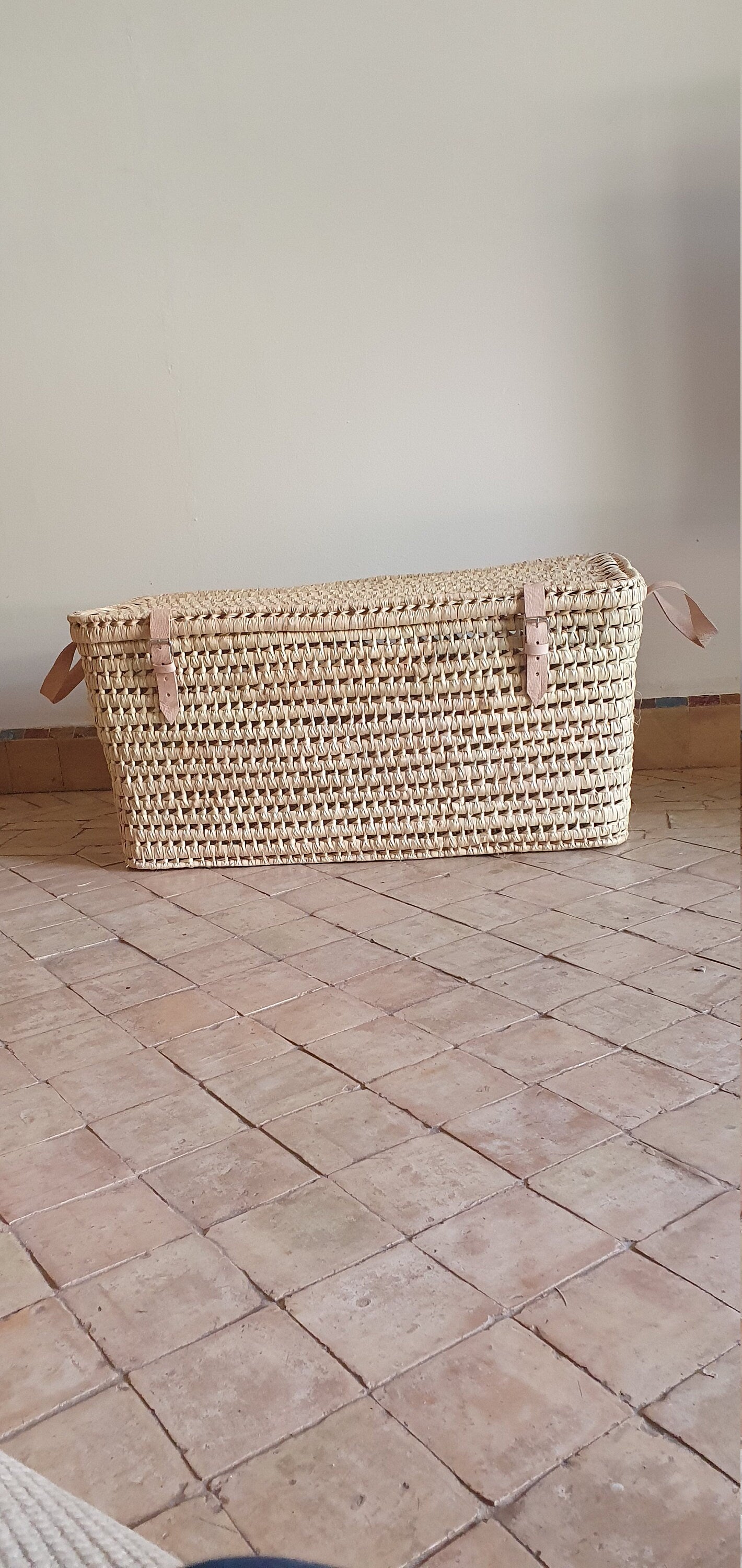 Ce Coffre de Rangement en feuilles de palmier anses en cuir offre une touche d'élégance naturelle à votre espace de vie main par des artisans de Marrakech . La teinte est douce, presque blanche, pour une touche naturelle et bohème. Elle peut s’intégrer à n’importe quelle pièce: un salon, une chambre d’enfants, une salle de jeux…