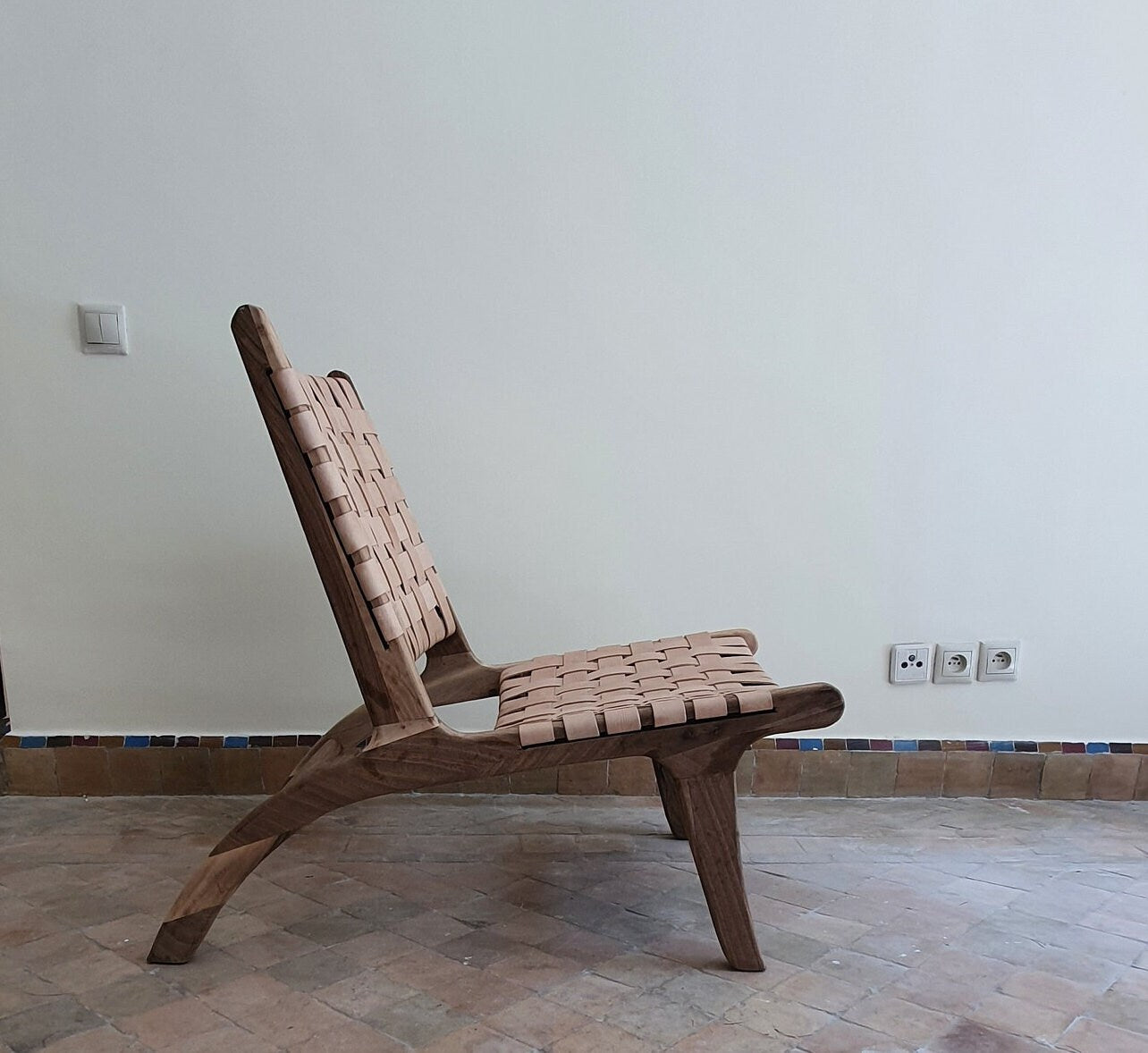 Fauteuil marocain artisanale en bois de noyé assise en cuir naturel