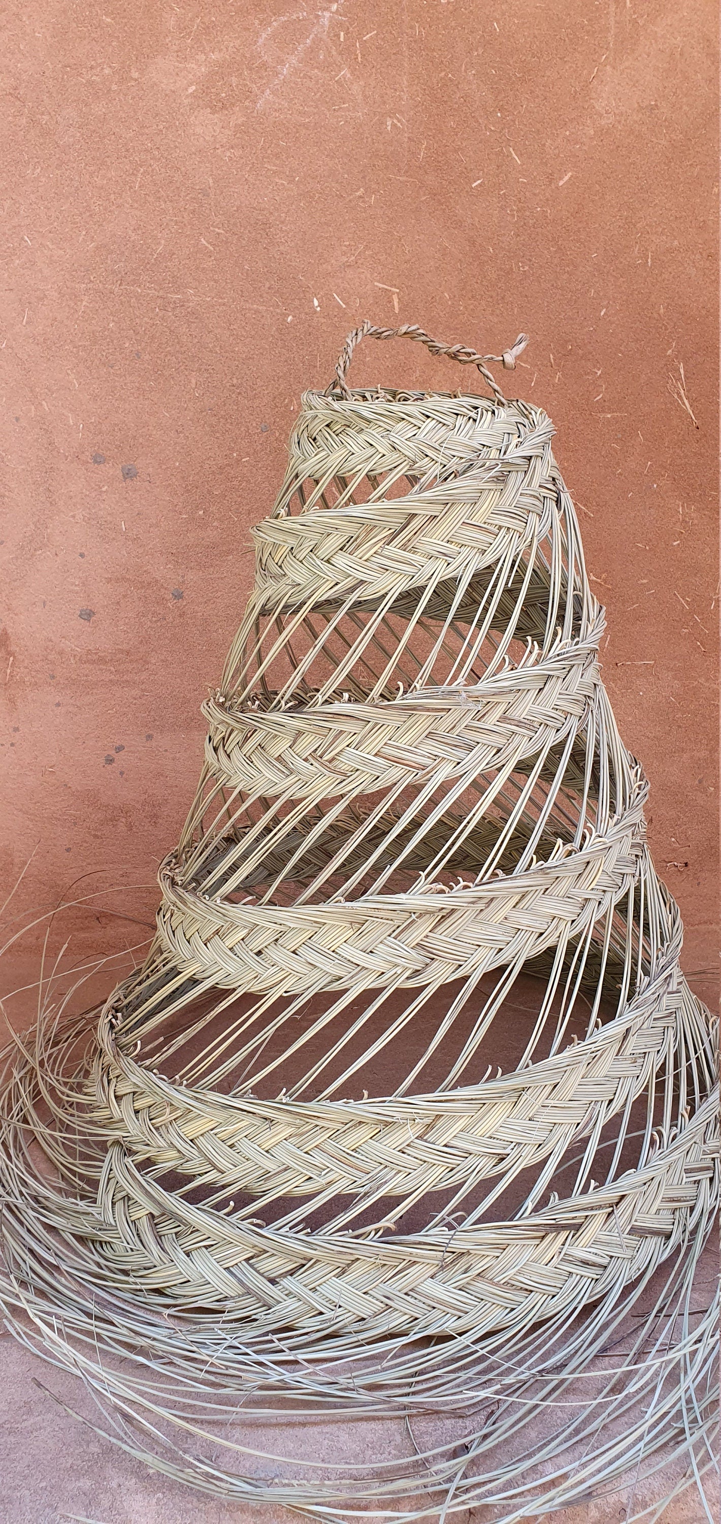 Mettre un peu Exotisme dans votre intérieur grâce a cette suspension marocaine Forme de frange cone suspension fait main en doum. Entièrement faits mains par des artisans marocains. Cette suspension est à suspendre au plafond grâce à la anse. Son tressage permet de laisser passer la lumière tout en gardant le côté chaleureux et cosy dans la pièce.