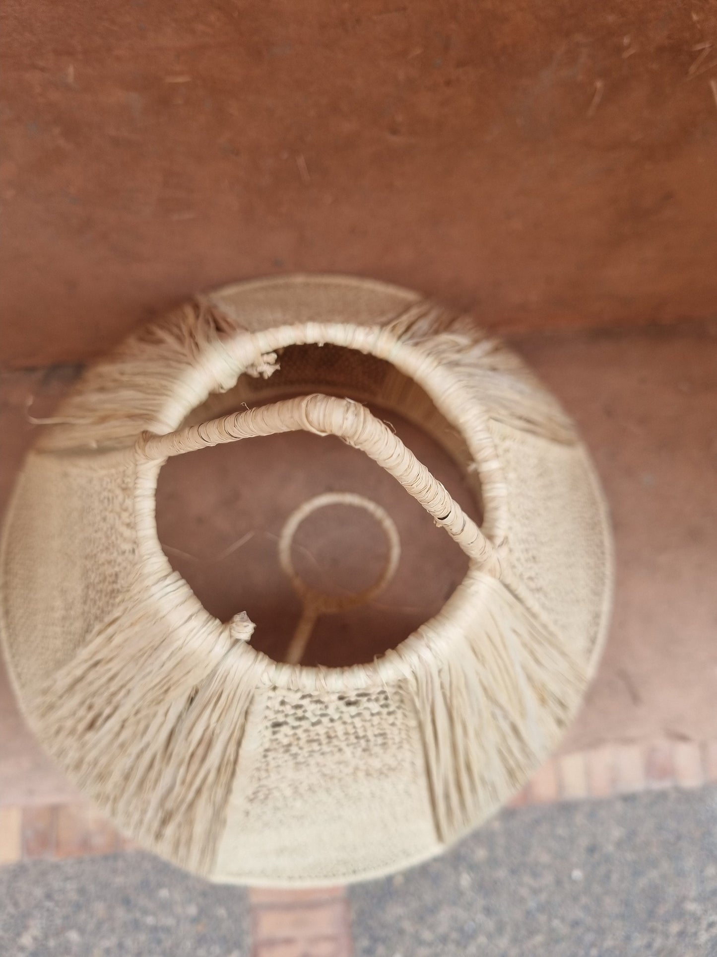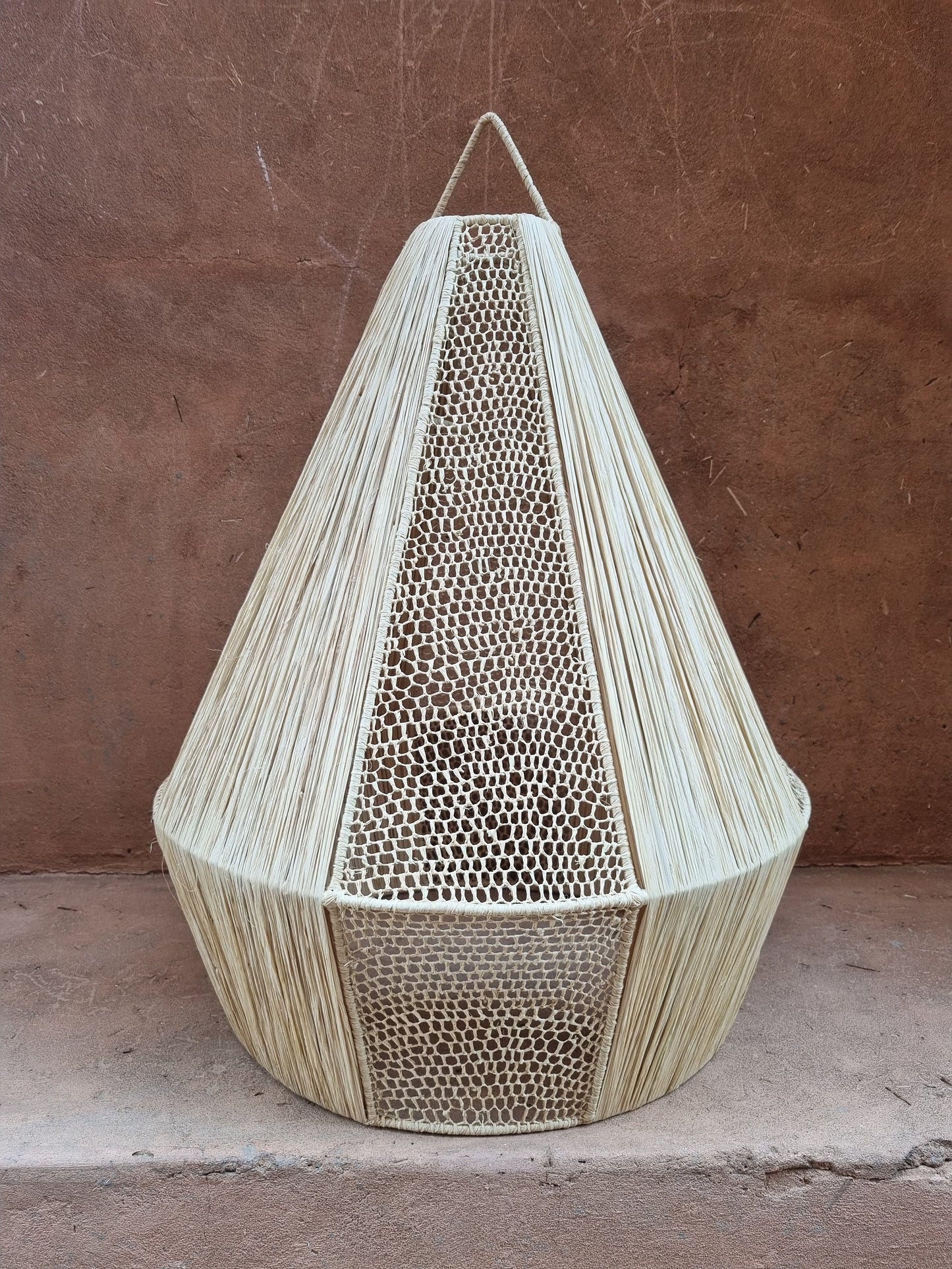 Suspension Luminaire rustique tressée matériau authentique pour un esprit bohème chic. Réalisé à la main, cet abat-jour en métal et fibres naturelles peut être suspendu au plafond grâce à la anse. Le tressage laisse passer la lumière pour apporter le côté chaleureux et cosy dans la pièce.
