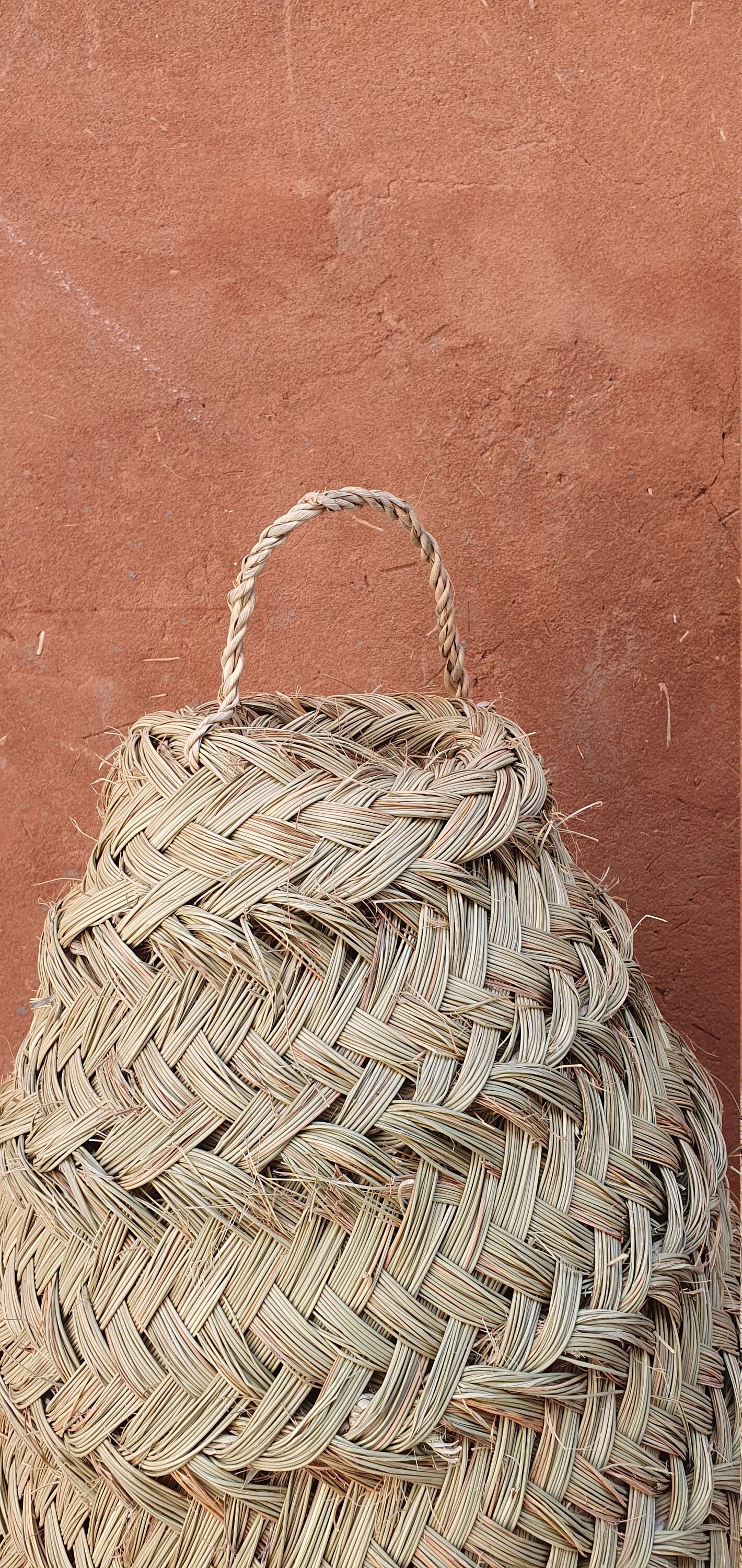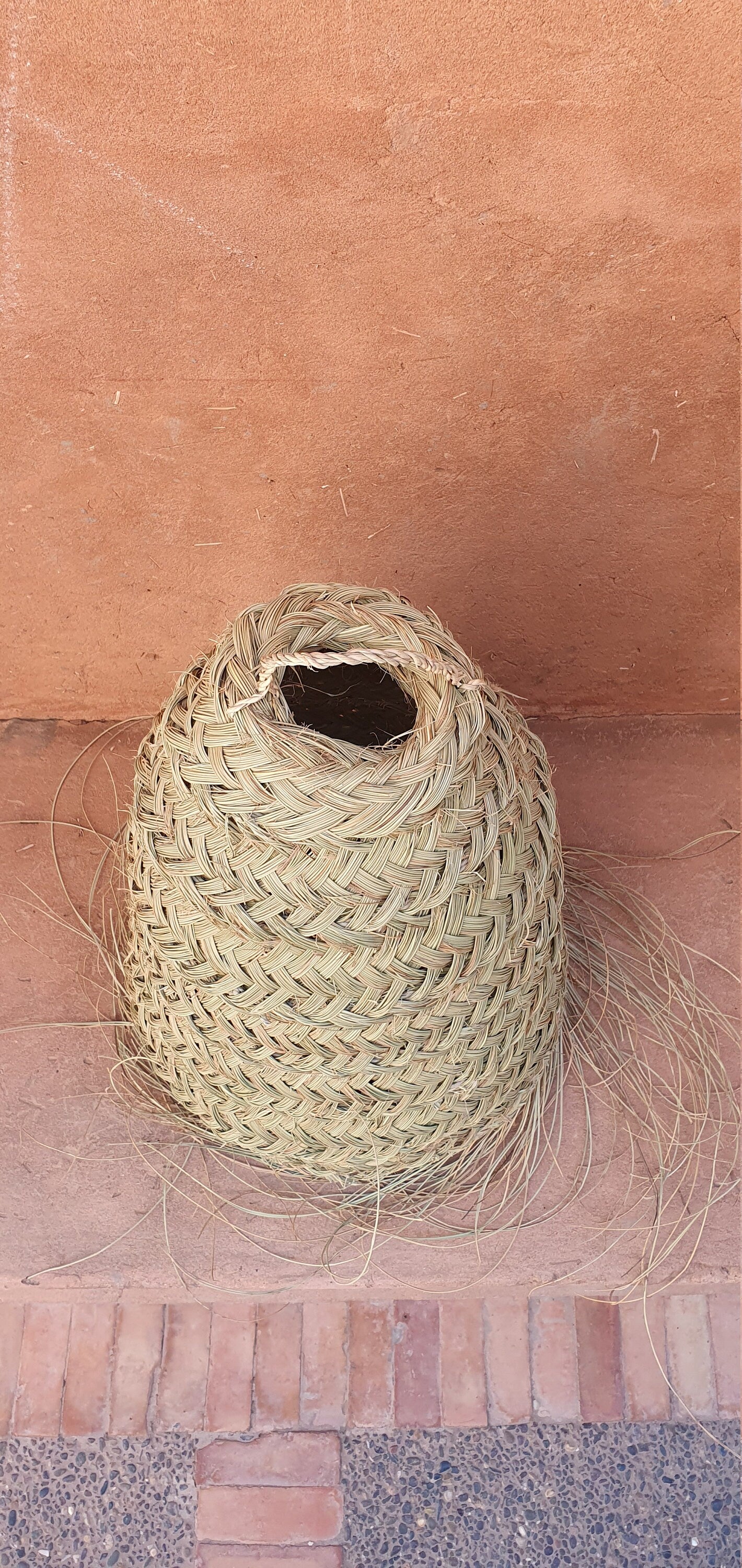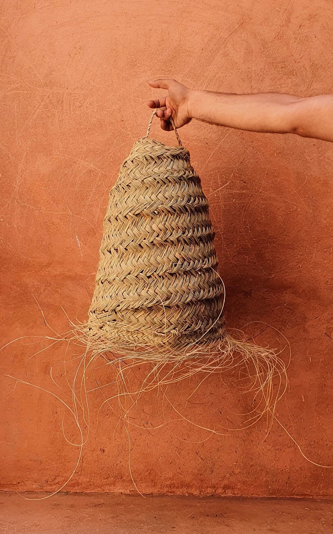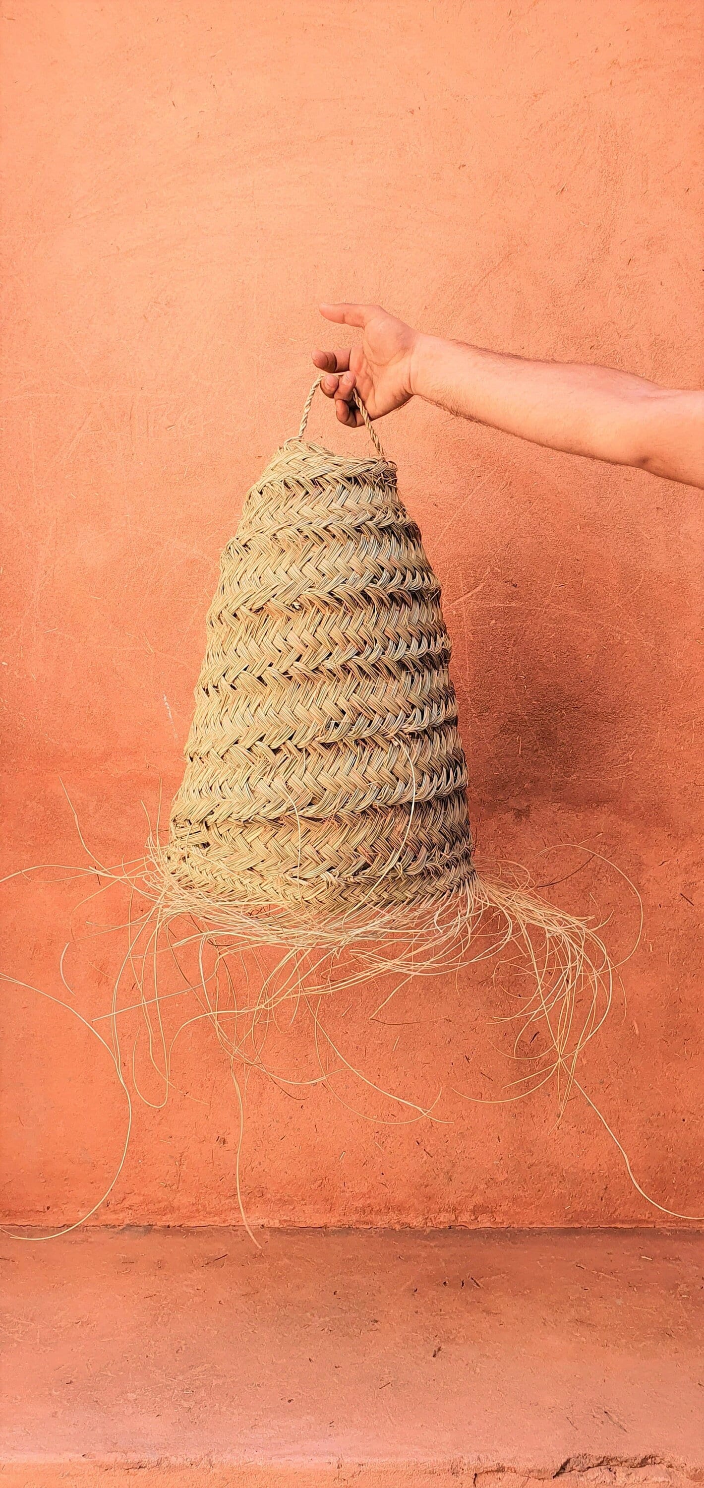 Ceci est fait à la main, Suspension Luminaire tube doum avec franges chaque piece est unique. Les Couleurs et les tailles peuvent varier en de l'état du Matériau. La couleur est souvent verte quand la matière est jeune et devient de plus en plus jaune avec le temps