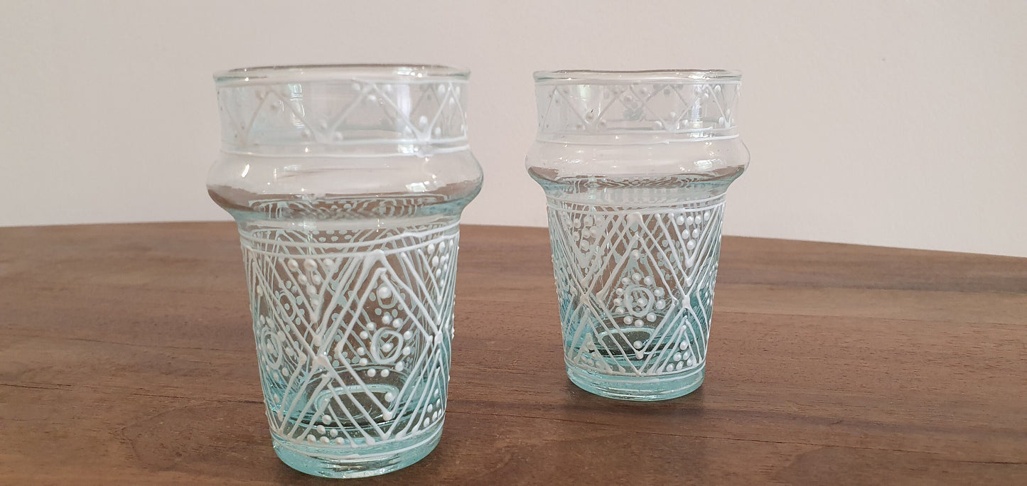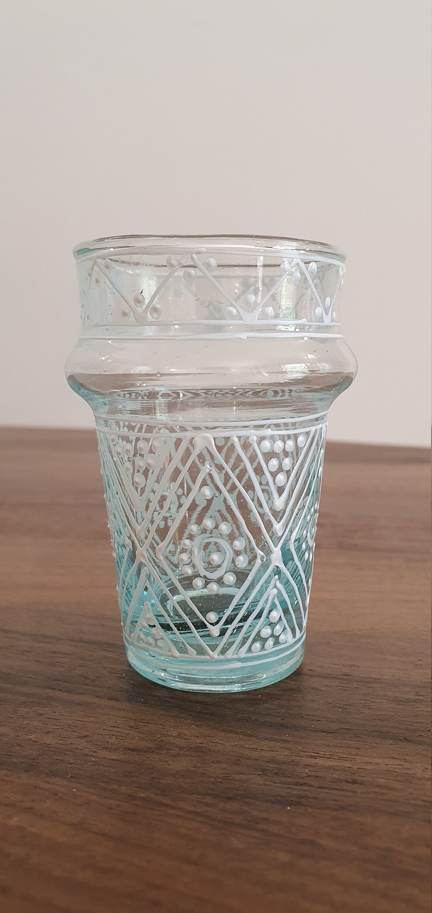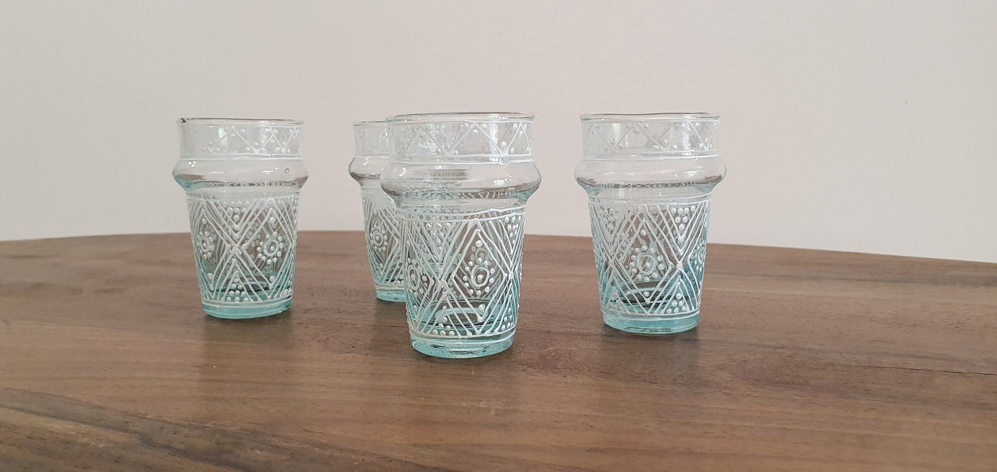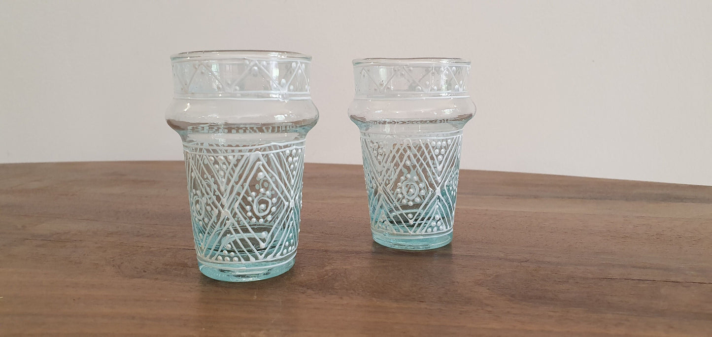 Verre à the marocain beldi peint à la main à la main au Maroc, soufflé à la bouche . Verre recyclé et soufflés à la bouche. Fait à la main au Maroc depuis les années 70. Ces verres apporteront une touche bohème et chaleureuse à votre table !
